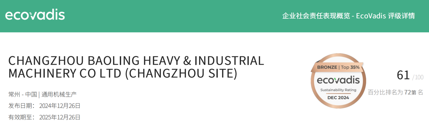 2024年12月26日,寶菱重工在EcoVadis企業(yè)社會責(zé)任評估中得分61分,并榮獲“銅牌”,在EcoVadis所有在評公司中躋身于前 35%(已超過 65% 以上的公司)。當前,“環(huán)境、社會責(zé)任和公司治理”(簡稱:ESG)水平已成為衡量企業(yè)長期價值和可持續(xù)發(fā)展能力的關(guān)鍵因素,其核心在于“友好環(huán)境、尊重員工、合規(guī)經(jīng)營、可持續(xù)發(fā)展”。公司將可持續(xù)發(fā)展理念融入企業(yè)戰(zhàn)略與日程經(jīng)營活動中,推動導(dǎo)入ESG